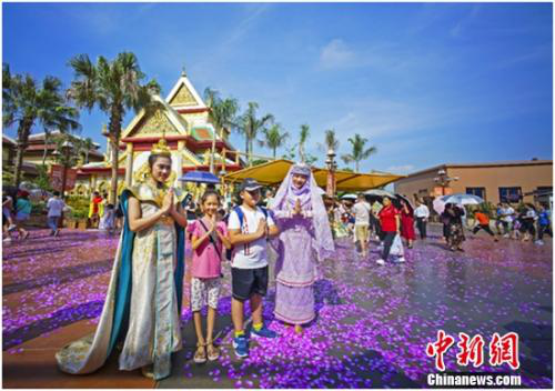 據介紹,方特東盟神畫讓游客不出國門,一站式“打卡”東盟十國。其中,《相約下龍灣》以參觀越南郵票展的形式,游客通過無軌跡尋跡游覽車跟隨主角一起感受當地特色水上集市、名勝古跡;《塔鑾盛典》則運用360度巨型環幕呈現了老撾象征千年塔鑾寺的建設歷程和歷史變遷;《千島之歌》主要以程控魔球、魔幻舞臺和經典演藝等形式,為游客呈現印度尼西亞獨有的節慶文化和民俗風情;《馬六甲勇士》通過大型漂流河道、水幕電影、海嘯災難模擬、虛實場景相結合,為游客講述了馬來西亞民族英雄漢都亞大戰海盜的傳奇故事。